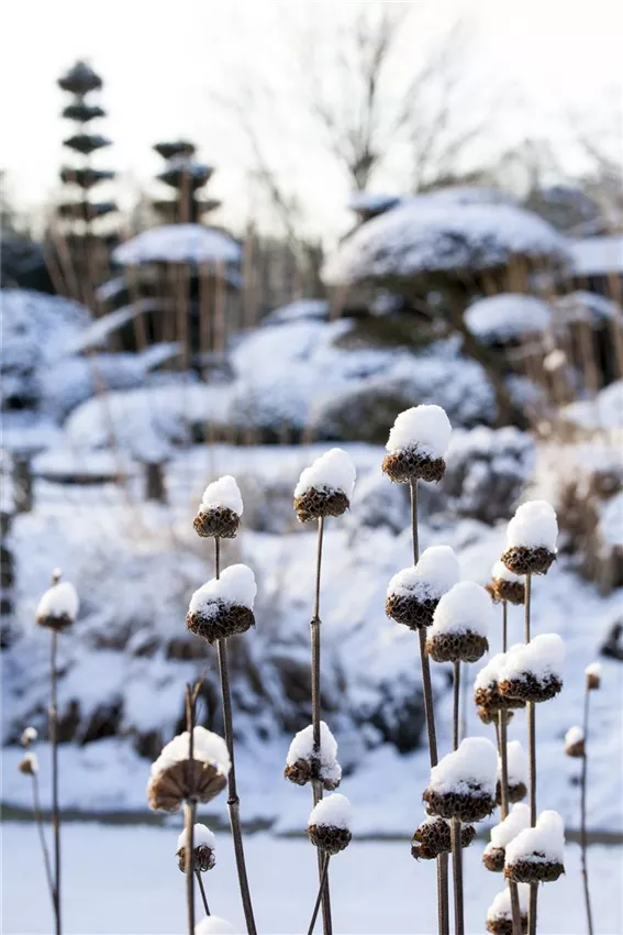 Das Spiel mit den Elementen kann sich aber auch schön auf Ziergräsern, wie Schilf, Bambus und Pampasgras machen, die in Kombination mit Eis und Raureif sehr stilvoll aussehen.