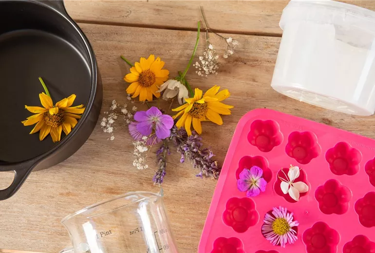 Die Materialliste für die Blumenseife ist überschaubar und auch die Herstellung ist kinderleicht. Seife sieden ist zwar eine aufwendige Angelegenheit, ist aber für die Herstellung der Blumenseife nicht erforderlich. Fertige Seifenrohmasse lässt sich im Handel kaufen und auf Glycerinbasis ist sie auch noch besonders gut für die Haut. Damit die Blüten auch hübsch zur Geltung kommen, sollte die Seifenrohmasse durchsichtig sein. Zuerst wird nur eine kleine Menge Seifenrohmasse geschmolzen und die Gießformen damit gefüllt, bis der Boden bedeckt ist. Dann können auch schon die Blüten mit dem Gesicht nach unten in die Förmchen gedrückt werden. Wenn die Seifenrohmasse etwas fest geworden ist, kann eine neue Portion geschmolzen werden. Dann werden die Gießförmchen bis an den Rand mit der neuen geschmolzenen Seifenrohmasse aufgefüllt. Wer mag, kann dann mit Aromaöl noch einen angenehmen Duft hinzugeben.