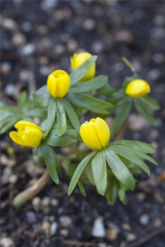 Die Knollen der Winterlinge werden 3 bis 5 Zentimeter tief in den Boden gesetzt. Halten Sie einen Abstand von 8 bis 10 Zentimetern ein: Blütenteppiche bilden die Pflanzen im Laufe der Zeit ganz von selbst. Um dem Winterling die Kältephase angenehm zu machen, können Sie die Pflanzstelle mit Kompost abdecken. Zwischen Februar und März recken die Winterlinge dann ihre Köpfe und freuen sich über eine regelmäßige Versorgung mit Humus, zum Beispiel durch Laub oder weiteren Kompost. Es reicht, diesen um die Pflanze herum zu verteilen. Einarbeiten in den Boden birgt die Gefahr, die flach vergrabene Knolle freizulegen. Winterlinge kann man hervorragend mit anderen Frühblühern kombinieren. Dafür können Sie auch eine Rasenfläche nutzen. Diese sollten Sie dann allerdings nicht vor Ende Mai mähen, weil das Laub des Winterlings erst dann einzieht. Sollten Sie sich dafür entscheiden, blühende Exemplare zu kaufen, können Sie diese im Frühling direkt in den frostfreien Boden pflanzen.