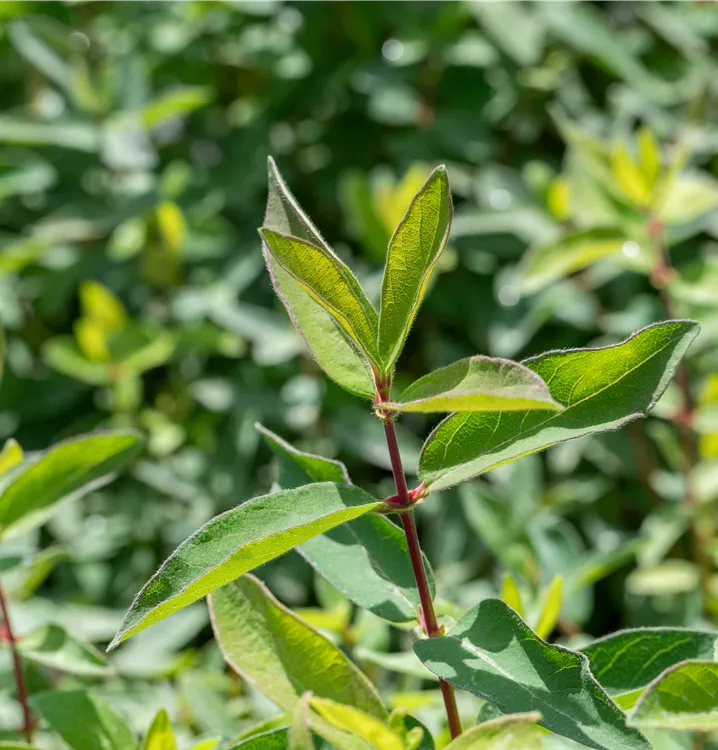 Die sommergrünen Blätter der Blaue Heckenkirsche 'Maibeere® Amur'(s) sind grau-grün, lanzettlich.