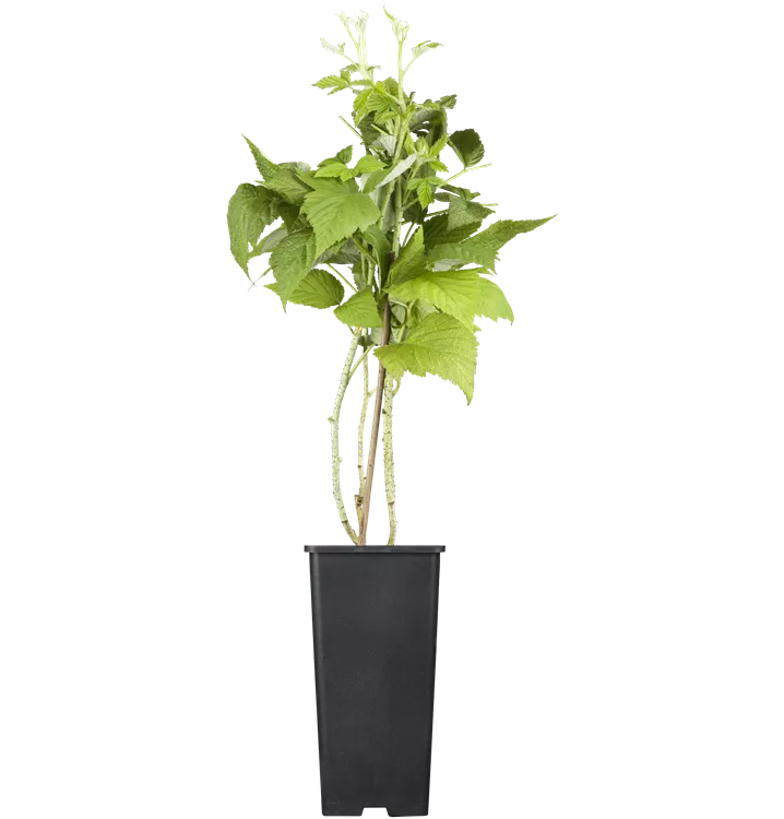 Himbeere 'Twotimer® Sugana®' ist ein aufrecht, überhängend und rankend wachsender Strauch, der eine Höhe von 1,5 - 1,8 m und eine Breite von 50 - 60 cm erreichen kann.