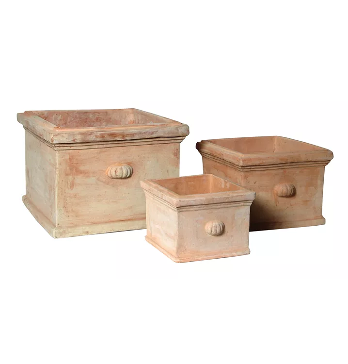 Terracottatöpfe in Würfelform mit Zierknopf. Klassische Form und Whitewash-Optik.
