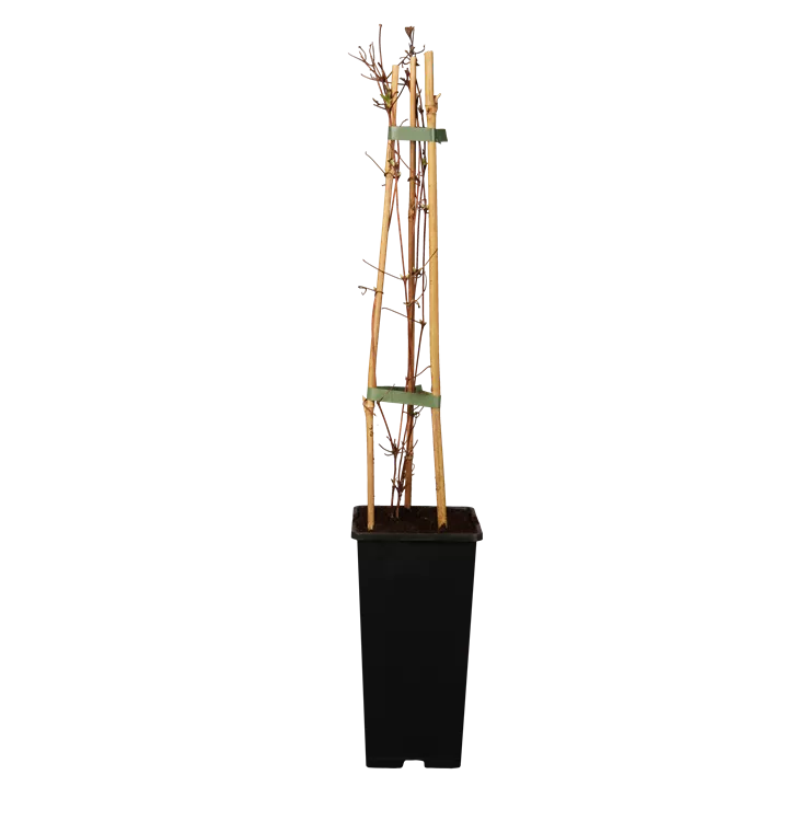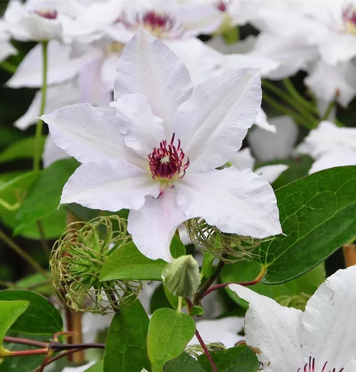 Waldrebe 'Miss Bateman' ist ein rankend wachsende Kletterpflanze, welche eine Höhe von 2 - 3 m und eine Breite von 0,5 - 1 m erreichen kann.