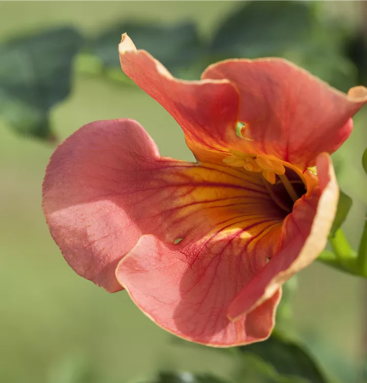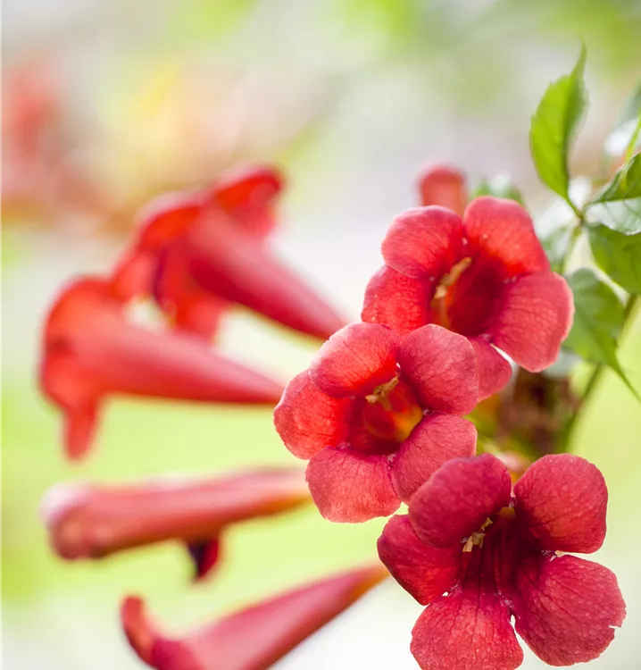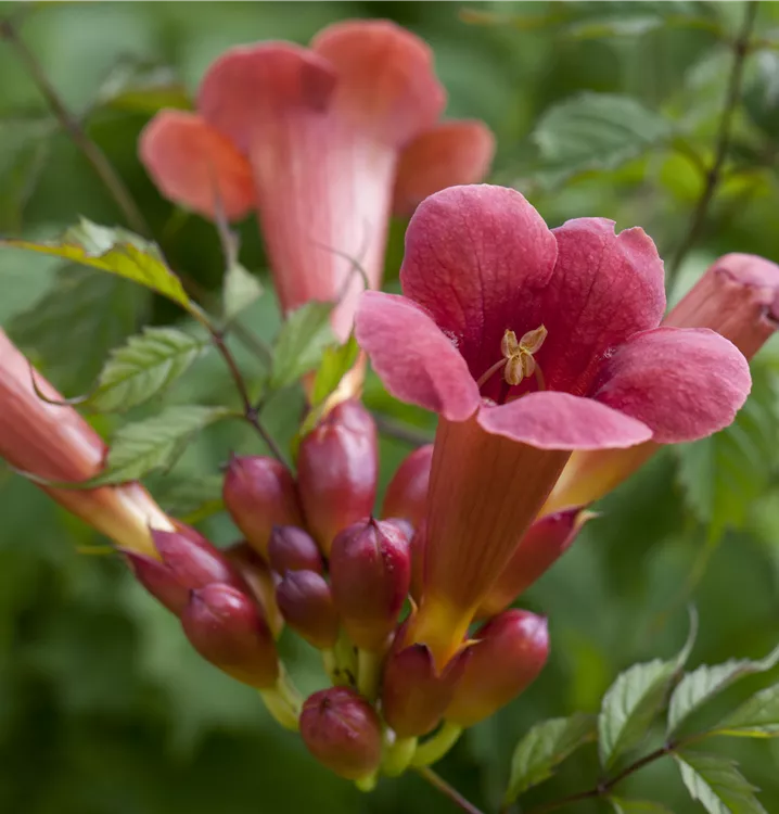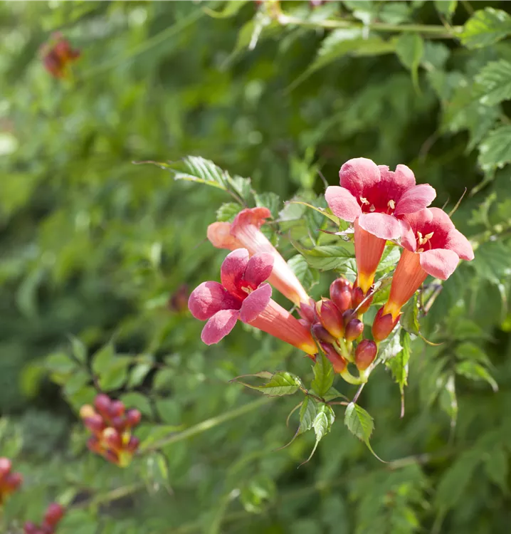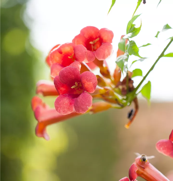 Die Rote Kletter-Trompetenblume (Campsis radicans) ist eine kletternde sommergrüne Pflanze, die rote, trichterförmige Blüten mit einem angenehmen Duft hervorbringt. Sie erscheinen von Juli bis September. Zudem trägt die Rote Kletter-Trompetenblume, gefiederte, mittelgrüne Blätter. An einem sonnigen bis halbschattigen Standort mit durchlässigem, nährstoffreichem Boden erreicht sie gewöhnlich eine Höhe von ca. 12 m und wird ca. 6 m breit.