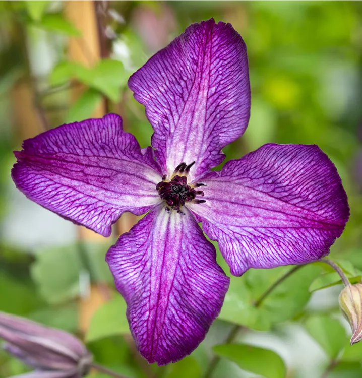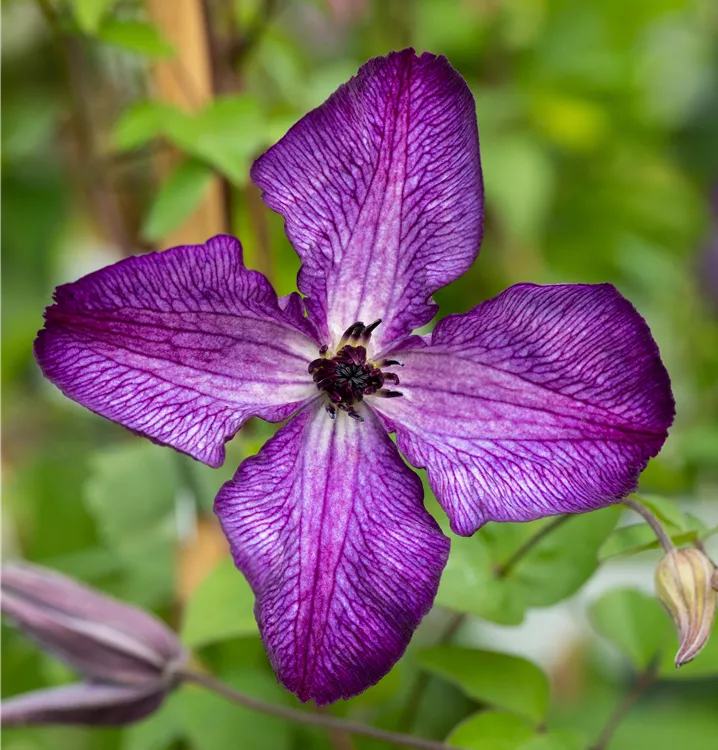 Die Waldrebe 'Super Nova' (Clematis viticella) ist eine rankende, sommergrüne Kletterpflanze. Ihre weiß-lilafarbenen, glockenförmigen Blüten erscheinen von Juni bis September. Die Blätter sind gefiedert und mittelgrün. An einem sonnigen bis halbschattigen, windgeschützten Standort mit durchlässigem, humosem, lockerem, sandigem, lehmigem Boden erreicht sie gewöhnlich eine Höhe von ca. 3 m und wird ca. 3,5 m breit.