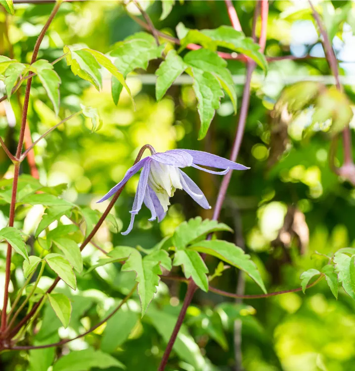 Die Alpen-Waldrebe (Clematis alpina) ist eine sommergrüne Kletterpflanze. Sie blüht von Mai bis Juni mit blauvioletten, glockenförmigen Blüten. Anschließend trägt sie dekorative, silberweiße Früchte. Ihre Blätter sind mittelgrün und gefiedert. An einem halbschattigen bis schattigen Standort mit durchlässigem, humosem, lockerem Boden erreicht sie gewöhnlich eine Höhe von ca. 3 m und wird ca. 1,5 m breit.
