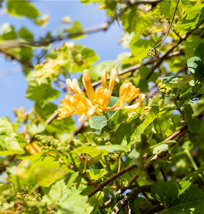 Die Gold-Geißschlinge (Lonicera tellmanniana) ist eine rankend wachsende, überhängende Kletterpflanze. Sie blüht von Mai bis Juli und trägt in dieser Zeit orangegelbe, röhrenförmige und in Quirle angeordnete Blüten. Anschließend bildet sie orangefarbene, runde Früchte. Die sommergrünen Blätter sind rundlich und dunkelgrün gefärbt. An einem sonnigen bis halbschattigen Standort mit durchlässigem, humosem, nährstoffreichem, lehmigem Boden erreicht sie gewöhnlich eine Höhe von ca. 6 m und wird ca. 4 m breit.