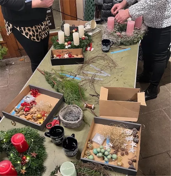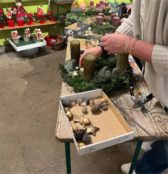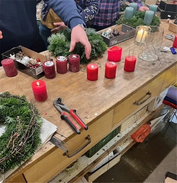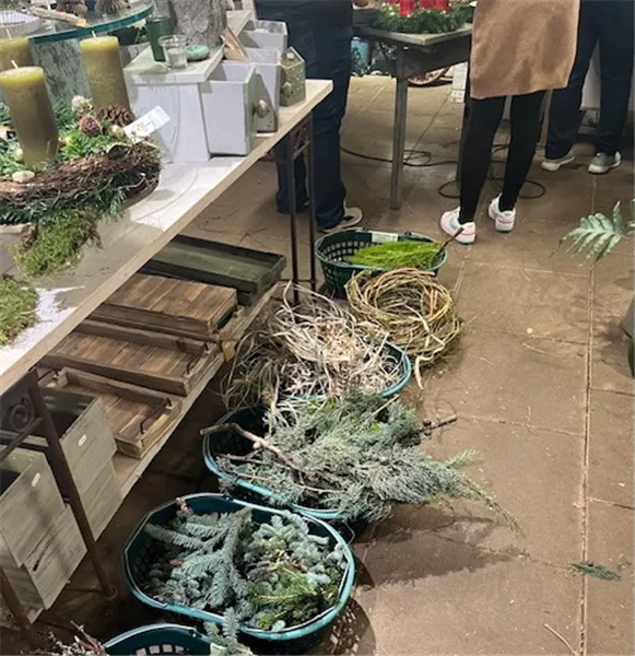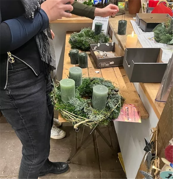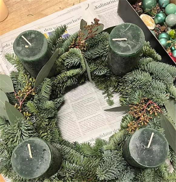 - Kranzrohlinge, Tannengrün, fertig gebundenen Kränze, Kerzen etc.